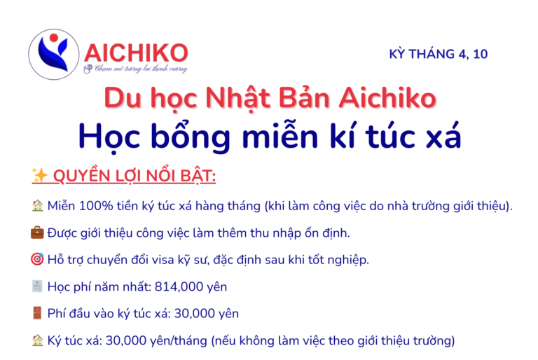 TUYỂN SINH DU HỌC NHẬT BẢN – HỌC BỔNG MIỄN PHÍ KÝ TÚC XÁ Kỳ nhập học: Tháng 4 & 10 Cơ hội vàng dành cho những bạn mong muốn vừa học – vừa làm – vừa tiết kiệm chi…