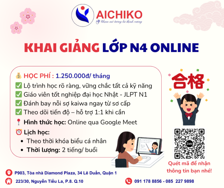 LỚP N4 ONLINE – NGHE NÓI LÀ CHÍNH, HỌC CHẮC TỪNG KỸ NĂNG Bạn đã học hết N5 hoặc N4 sơ cấp, nhưng… * Nghe tiếng Nhật mà “mất sóng”? * Ngữ pháp học rồi nhưng hay quên? * Kanji…