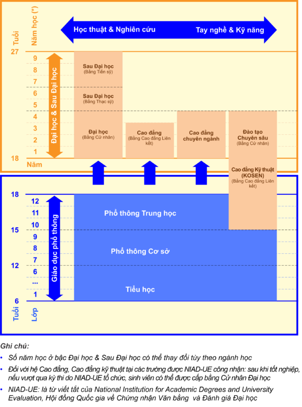 - Hoặc ghi danh vào trường cao đẳng kỹ thuật. Thông thường, học sinh đã hoàn thành chương trình lớp 11 ở nước mình có thể được nhận ngay vào năm thứ 3 của trường cao đẳng ở Nhật. Sau khi tốt nghiệp, Bạn lại có thể đăng ký tiếp tục học thêm 3 năm chuyên sâu ngành Bạn đã học ở trường cao đẳng để lấy bằng cử nhân đại học.