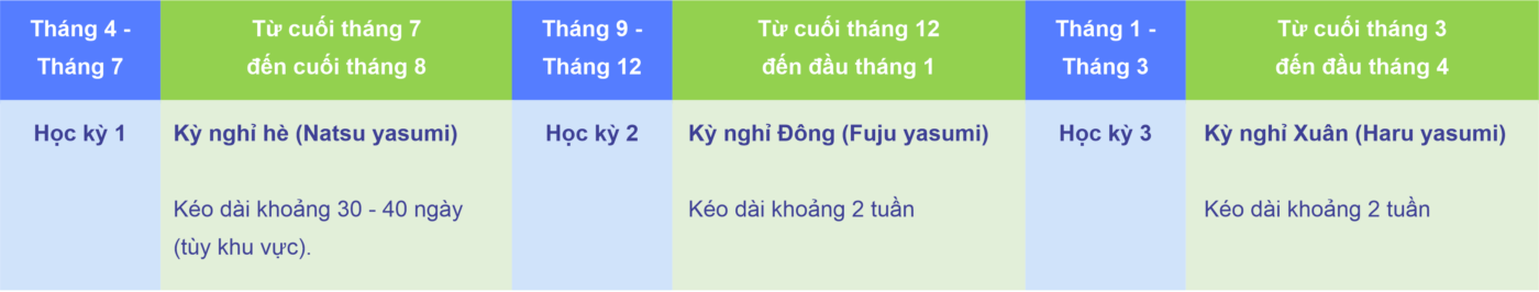 Năm học mới ở Nhật bản bắt đầu từ tháng tư và kết thúc vào tháng 3 năm sau (tuy nhiên cũng có những trường tuyển sinh cho kỳ nhập học vào mùa thu (tháng 9 ~ 10). Xen giữa 3 học kỳ là 3 kỳ nghỉ.