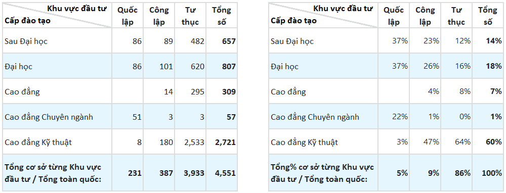 Với 3,933 cơ sở đạo tạo, khu vực đầu tư tư nhân chiếm 86% tổng số lượng cơ sở đào tạo trong cả nước, chủ yếu tập trung vào cấp đào tạo cao đẳng (2,831 cơ sở).