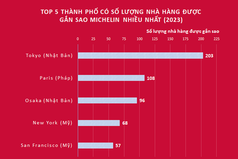 Theo Guide Michelin 2023, Tokyo là thành phố có số lượng nhà hàng được gắn sao Michelin nhiều nhất (203), vượt xa 2 thủ đô vốn đã nổi danh là thiên đường ẩm thực của thế giới: Paris (108) và New York (68). Đây là năm thứ 15 liên tiếp Tokyo giữ vững vị trí này kể từ khi xuất hiện lần đầu tiên trên Guide Michelin 2008.